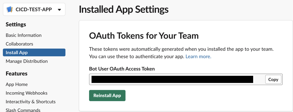 이제 Install App탭을 선택해서 제가 만든 슬랙 채널(워크스페이스)에 설치해주겠습니다.