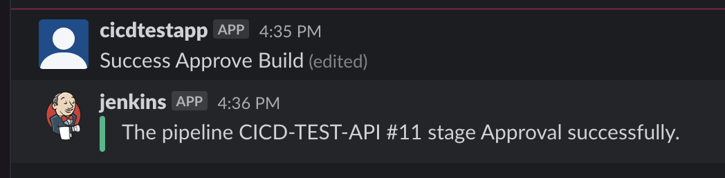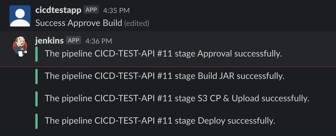 slackSend channel: '#jenkins', color: 'good', message: "The pipeline ${currentBuild.fullDisplayName} stage Approval successfully."