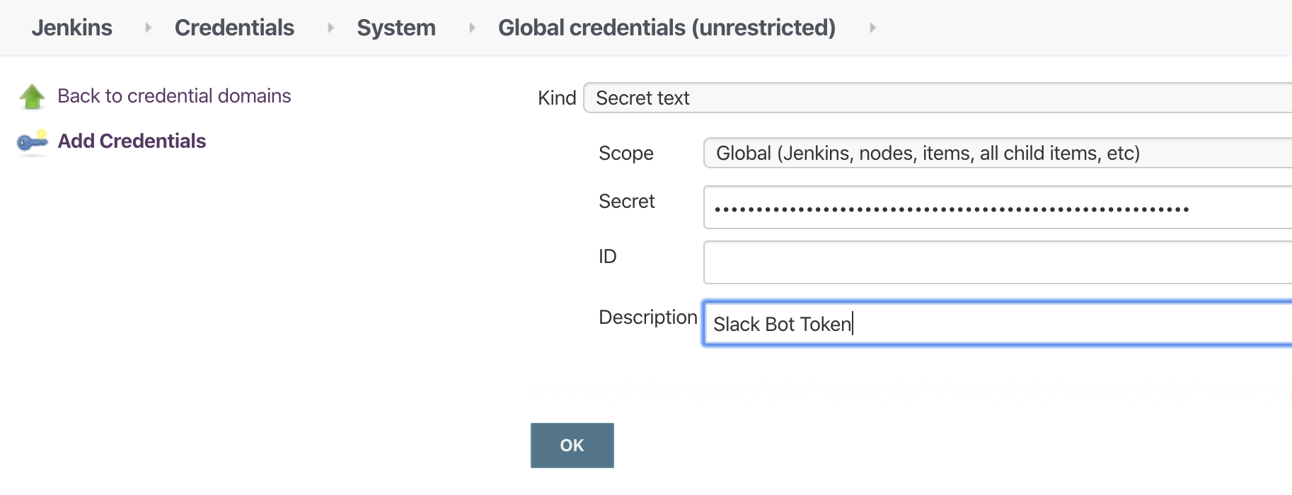먼저, Slack Bot Token 값을 Credentials에 만든 후, 젠킨스 잡에서 변수로 넣어주도록 하겠습니다.