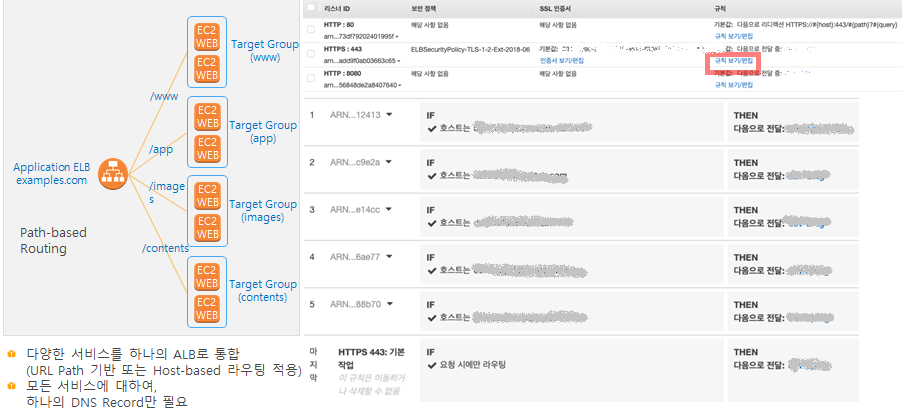 위와 같이 호스트 헤더 기반으로 하나의 ALB에서 타겟그룹을 포트별로 구성해 준 후