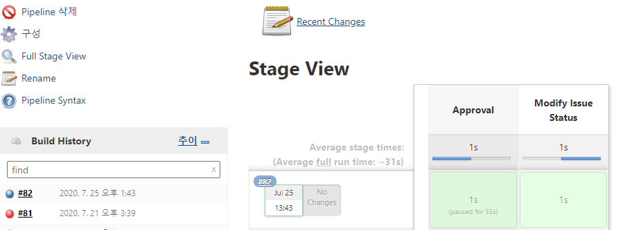 JIRA Web Hook이 아주 성공적으로 작동하여서 아래 젠킨스 파이프라인이 진행된 것을 볼 수 있습니다.