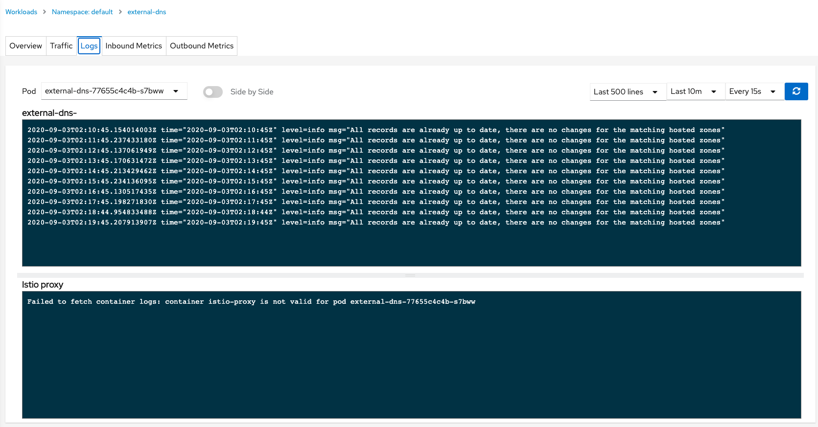 External-DNS의 파드 로그를 아래와 같이 대시보드에서 실시간으로 체크하는 모습을 보실 수 있습니다.