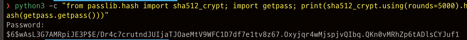python3 -c "from passlib.hash import sha512_crypt; import getpass; print(sha512_crypt.using(rounds=5000).hash(getpass.getpass()))"