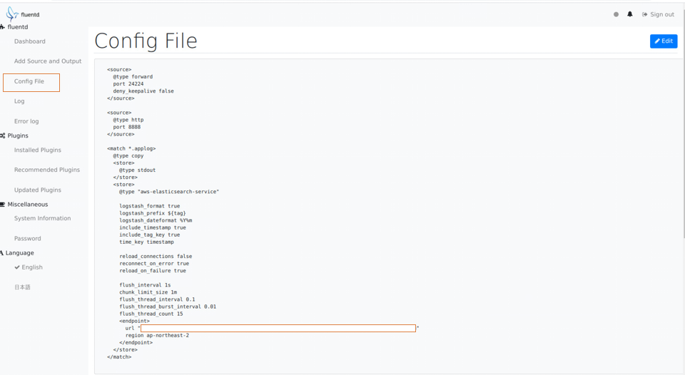이제, localhost:9292 로 접속하여, admin/changeme 로 로그인 한 후 config 파일을 아래와 같이 수정하도록 하겠습니다.