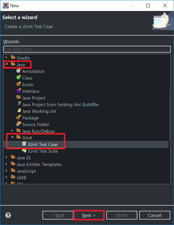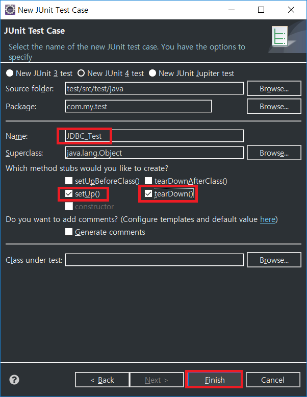 new -> other에서 위의 경로로 들어가 JUnit Test를 생성해주자.