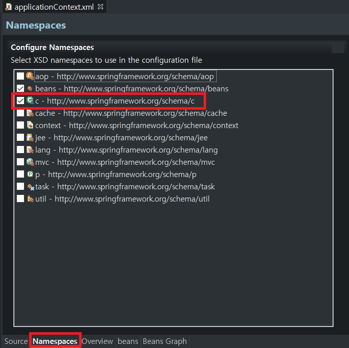 위와 같이 만든 후에는 밑에서 Namespace를 클릭해 C태그를 넣어주자