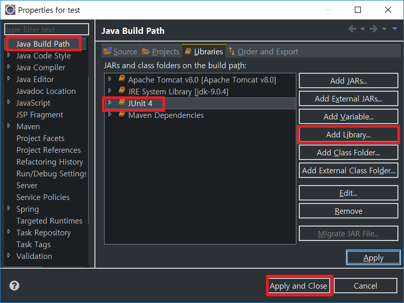 Properties에서 JUnit4 라이브러리를 추가해주자.