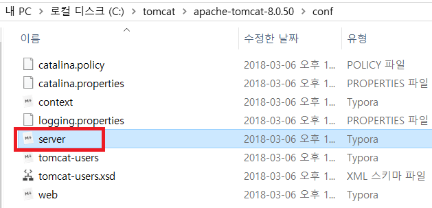 C:\tomcat\apache-tomcat-8.0.50\conf 로 들어간 후 server.xml파일을 열자