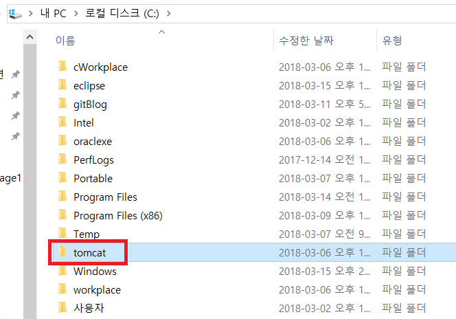 C드라이버에 tomcat폴더를 만들어 준 후 그 안에 압축을 풀자.