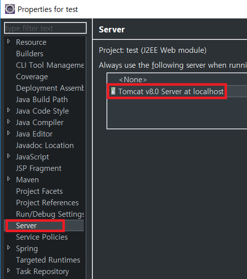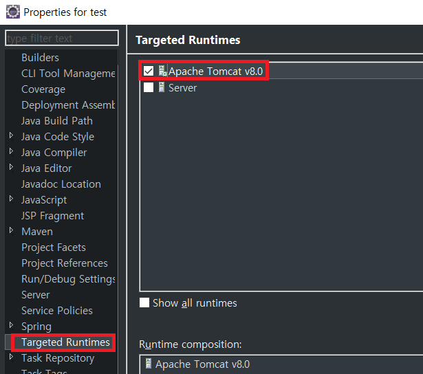 Targeted Runtimes에서 아까 설정해준 Server를 클릭한 후 Apply를 해주자.