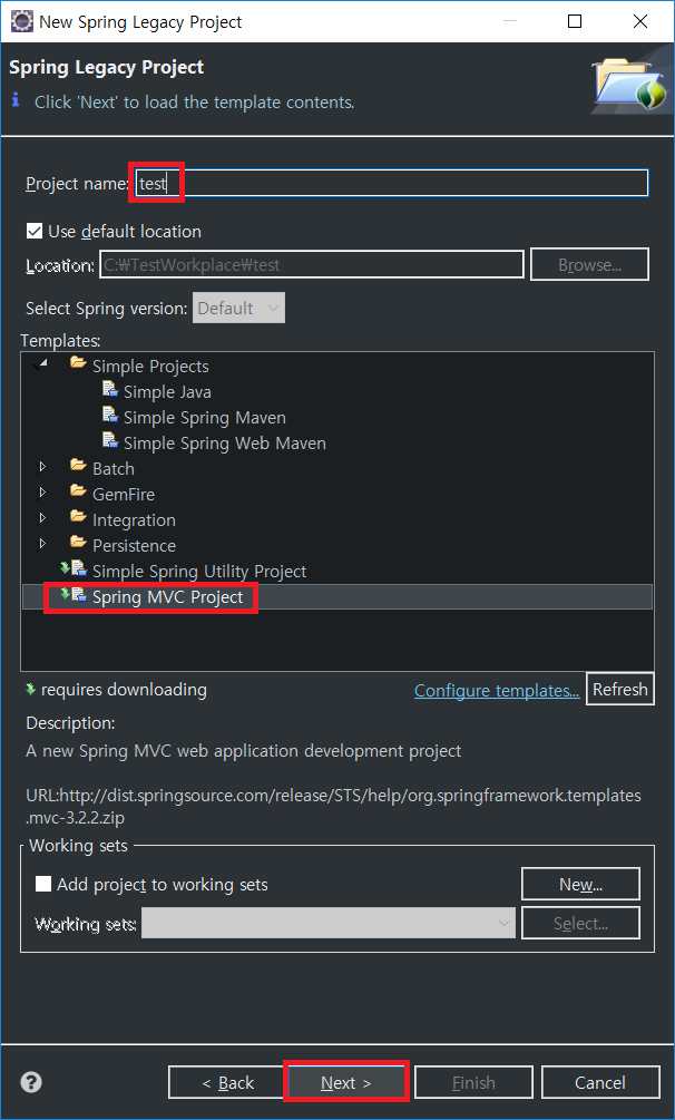 project 이름을 입력하고 Spring MVC Project를 선택한 후 다음으로 넘어가자