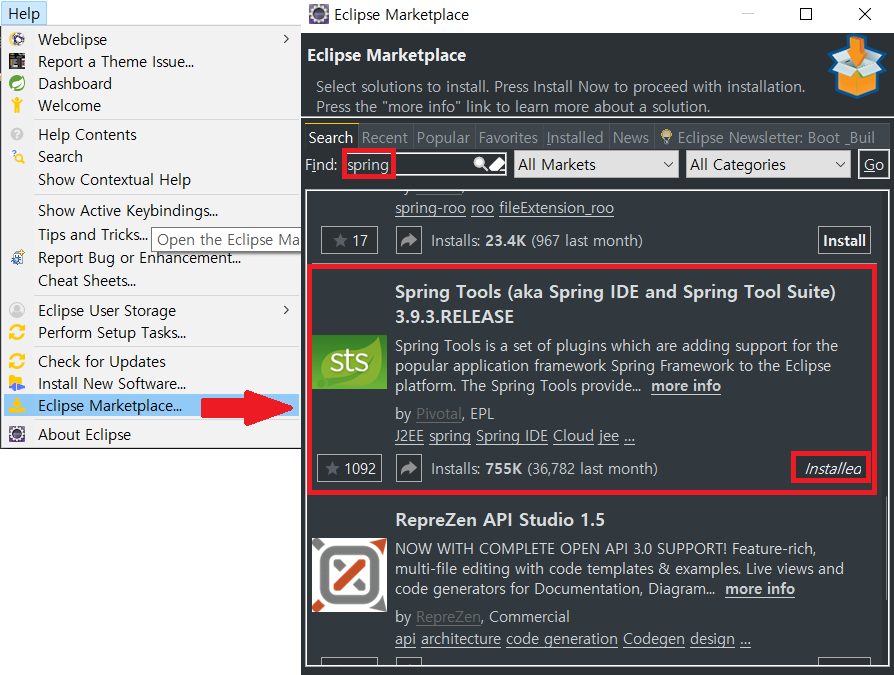 먼저 Spring Tool을 설치하도록 하자. 위와같이 검색하여 쭉~설치하면 된다.