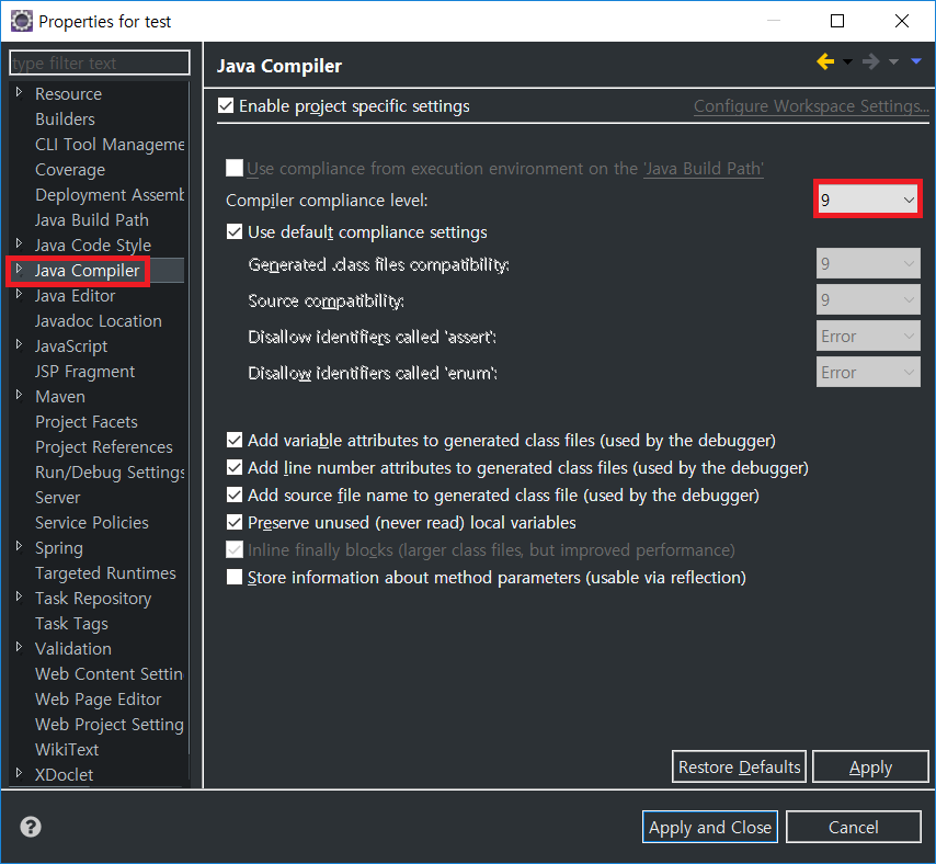 다음은 Java Compiler에서 컴파일러 버전을 위의 선택한 JDK버전과 같게 맞춰주도록 한다.