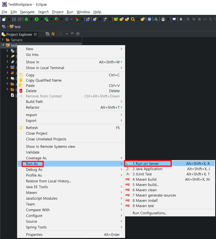 이제 프로젝트에서 우클릭한 후 Rus As -> Run on Server를 클릭하여 서버를 실행시켜주자.