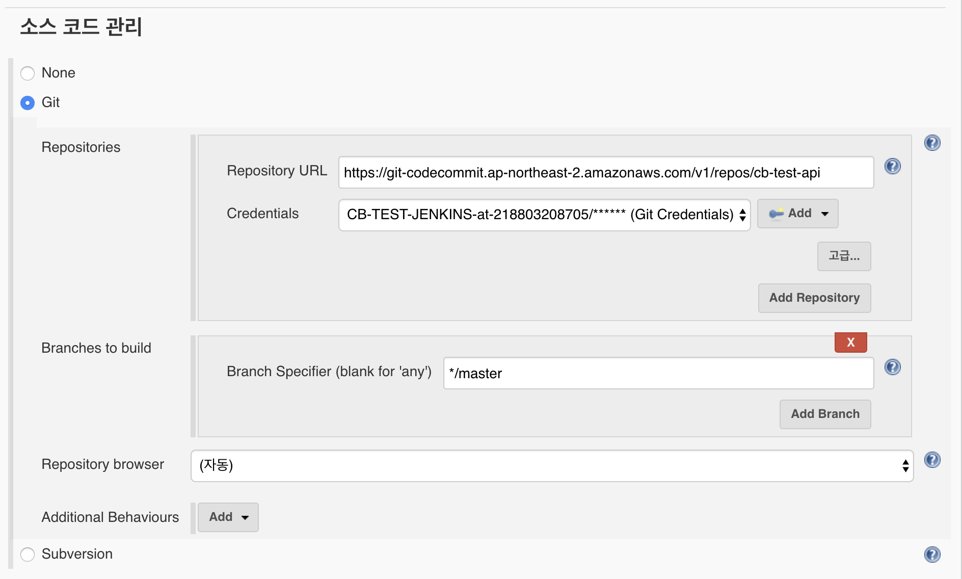 잡을 만들었으면, 소스 코드 관리에서 해당 url과 등록해놓은 credentials를 선택해줍니다.
