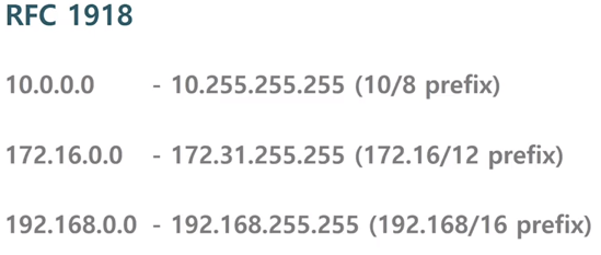 하지만 네트워크 대역을 구성할 때, 아래 RFC 1918규약을 따를 것을 권유하고 있습니다.