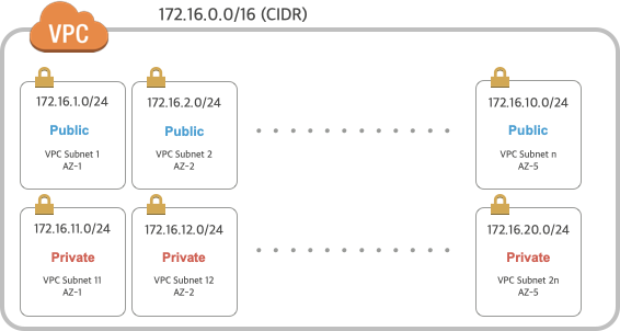 즉 하나의 region의 VPC CIDR에 해당하는 네트워크 IP대역을 몇 개의 영역으로 나누어 사용하는 것을 말합니다.