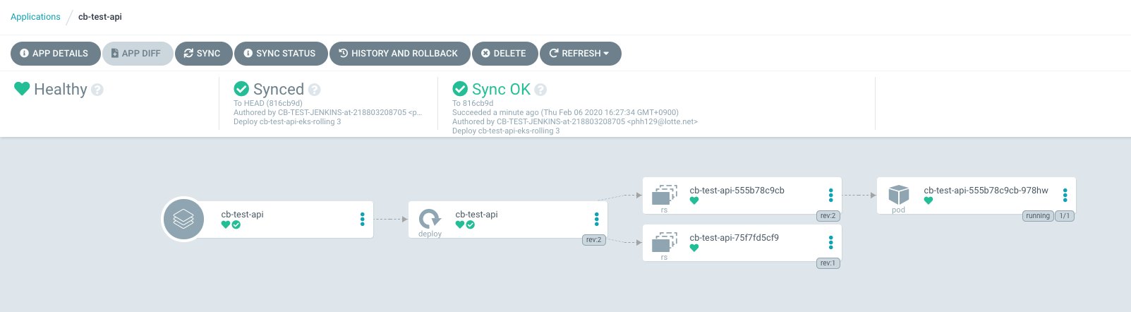 ArgoCD에서 배포되는것을 실시간으로 UI를 통해 보실 수 있으며 이전 배포버전 내역도 볼 수 있습니다.