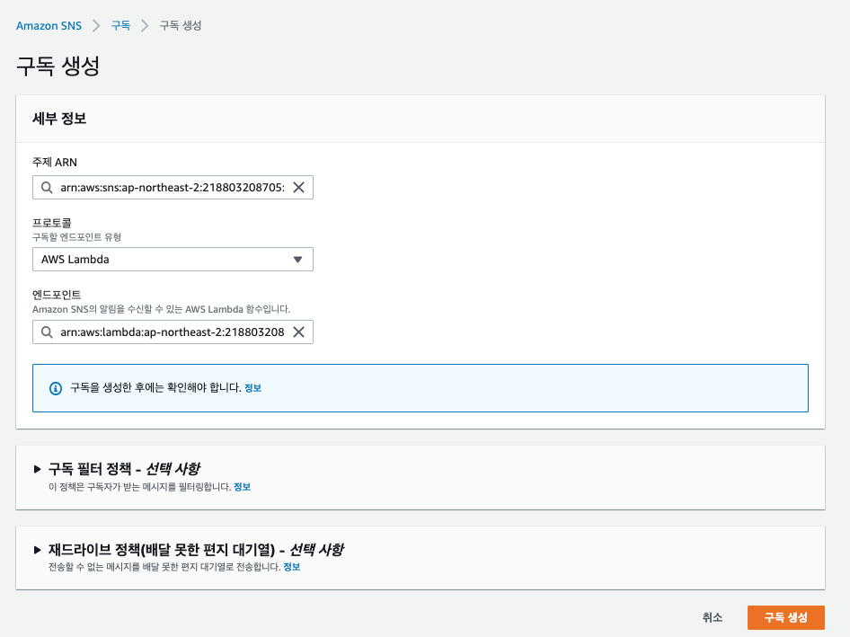SNS에서 구독을 람다로 만들어서 위에서 만든 람다를 매핑시켜주시면 됩니다.