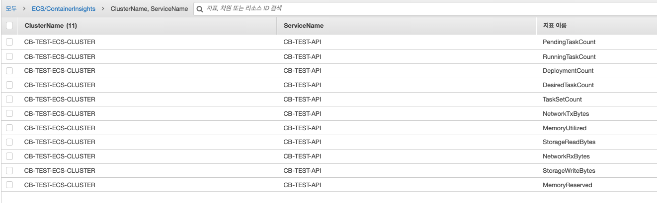 기본 ECS 지표에서도 CPU 및 Memory 사용률을 보실 수 있습니다.