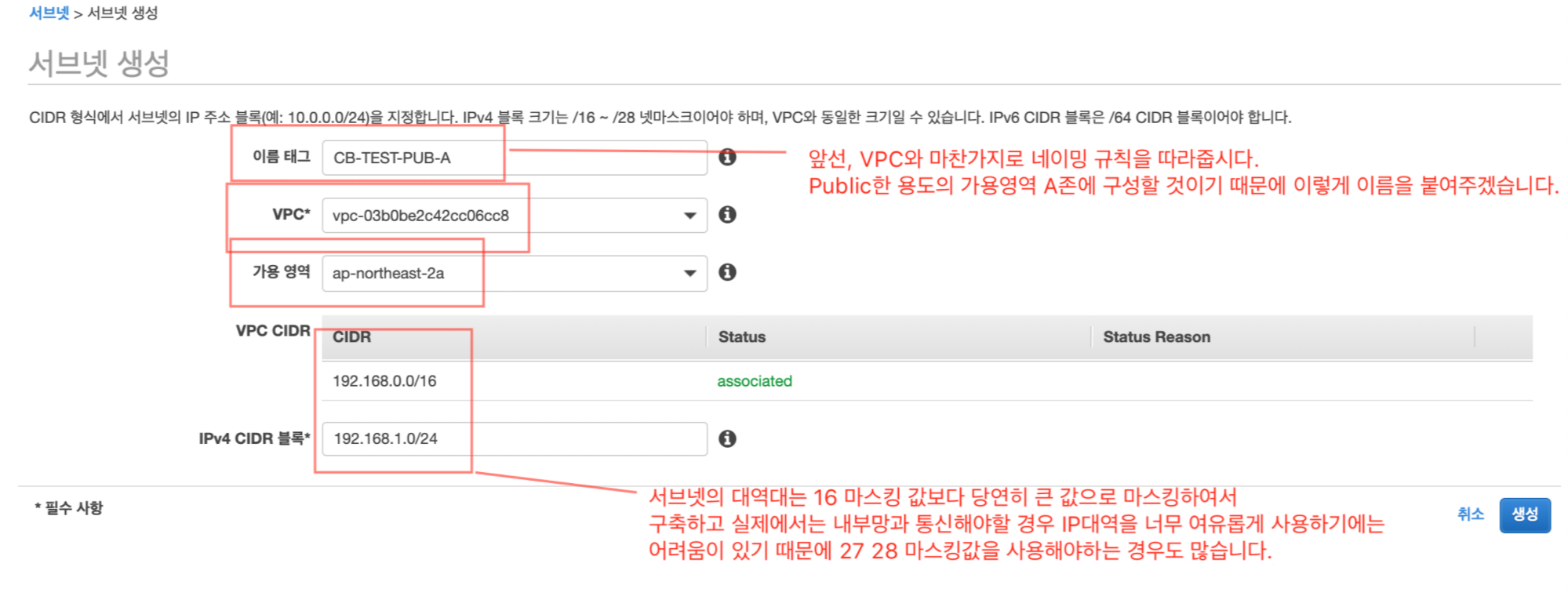 그리고 CIDR에 대한 부분을 원하시는 대역에 맞춰서 구성해주시면 되겠습니다.