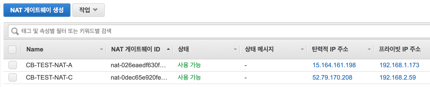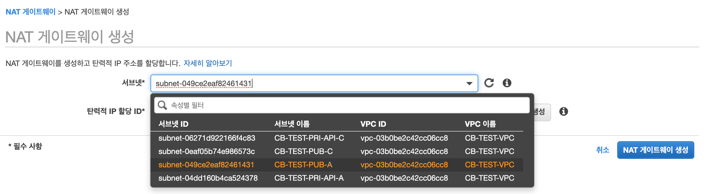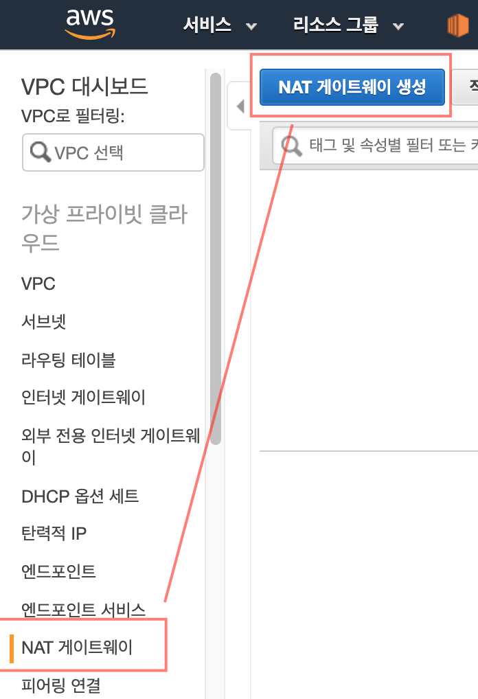 이제 왼쪽의 NAT게이트웨이 메뉴에서 NAT GW를 구성해 봅시다.