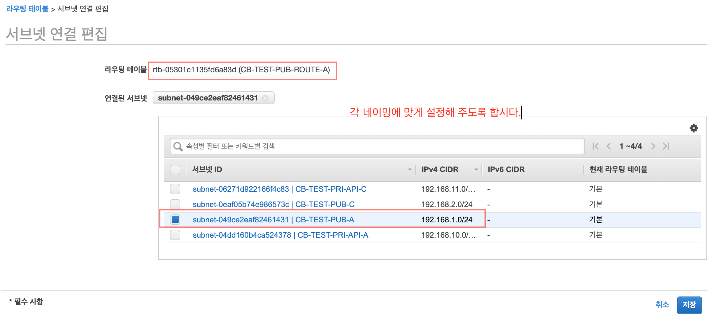 이제 라우팅 정의가 되었으므로 어떤 서브넷이 해당 규칙을 따를지 골라주도록 합시다.