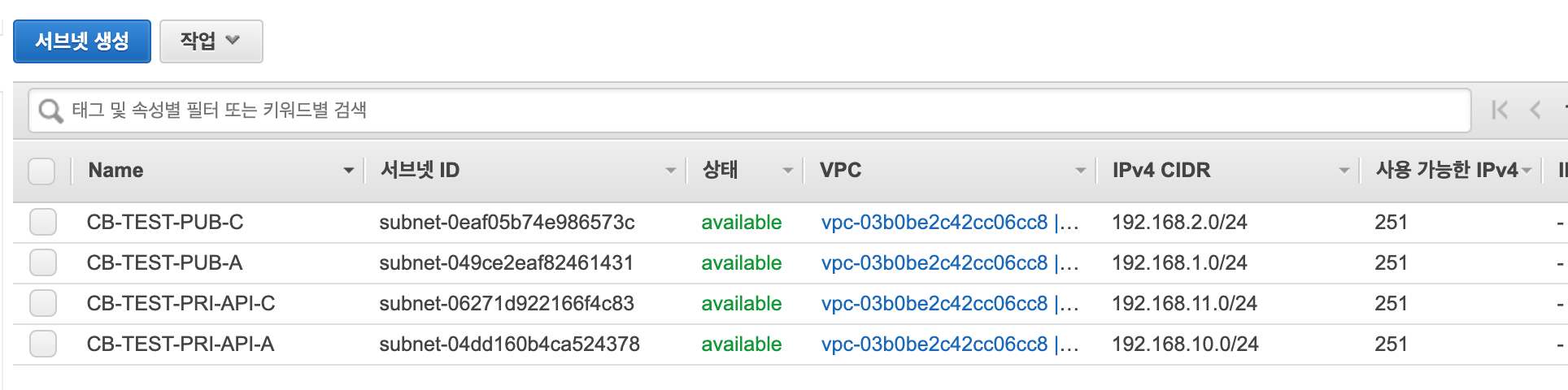 그렇게 총 4개의 서브넷을 아래와 같이 만들어 주면 됩니다.
