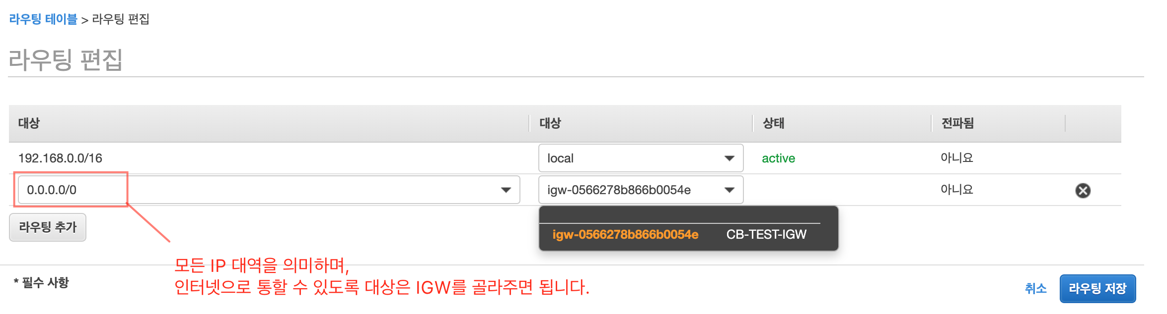 Public망은 모든 대역대가 IGW를 향할 수 있게 해주면 됩니다.