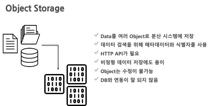 즉, 계층구조가 없으며 오브젝트 스토리지에서 데이터는 오브젝트라 불리는 개별 단위로 나뉘어,