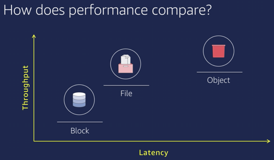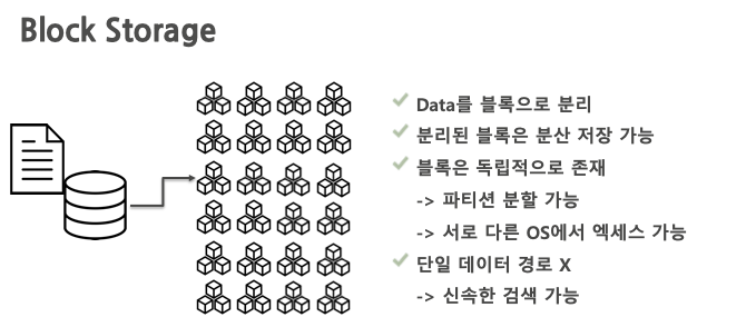 Block Storage의 경우에는 어떠한 계층구조가 존재하지 않고 직접 엑세스 하는 구조이기 때문에 Latency가 낮고,