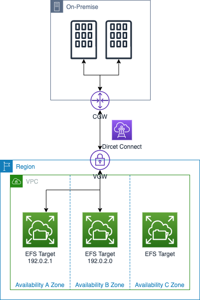 또한 On-Premise 환경에서도 아래와 같은 구조(DX, VPN등)를 이용하여서 EFS를 사용할 수 있습니다.