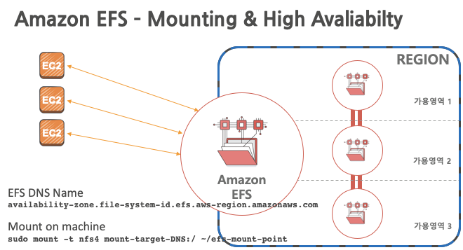 EFS는 위와 같은 명령어를 통해 쉽게 마운트 하여서 여러 EC2에서 HA를 구성하여 사용할 수 있습니다.