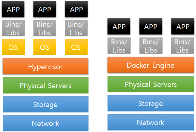 하지만 도커 컨테이너에서는 Docker-engine 위에 어플리케이션에 실행에 필요한 바이너리만 올라가게 됩니다.