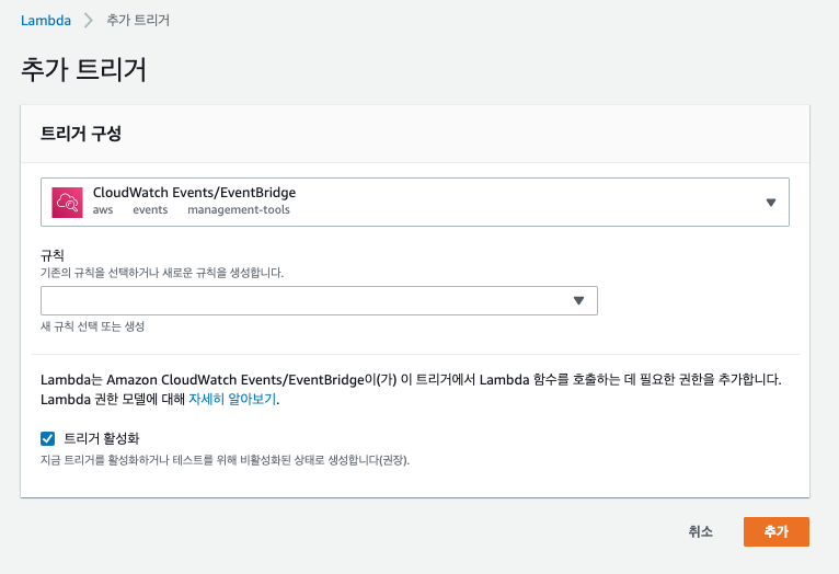 마지막으로 Cloudwatch Event를 추가해서 크론으로 람다를 돌리게 하겠습니다.